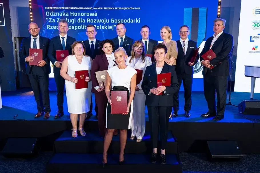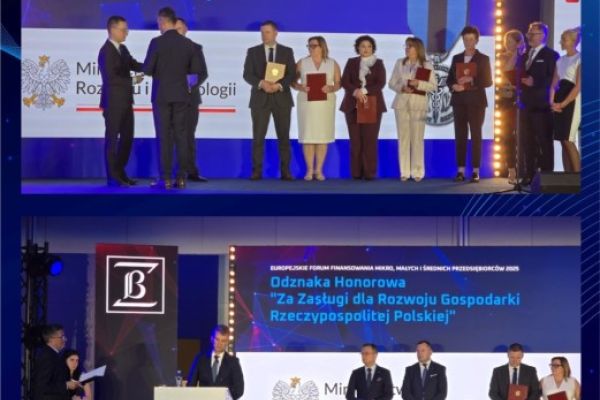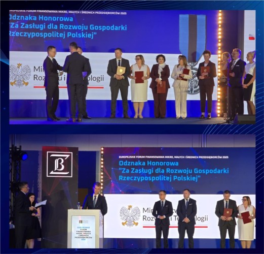 Uroczyste wręczenie odznaczenia miało miejsce podczas Gali Liderów Finansowania Konkurencyjności i Eksportu, która odbyła się w ramach Europejskiego Forum Finansowania Mikro, Małych i Średnich Przedsiębiorców 2025 w Warszawie. W wydarzeniu wziął również udział Wiceprezes Zarządu Banku – Pan Robert Malinowski, reprezentując wspólnie z Prezesem naszą instytucję w tym prestiżowym gronie.